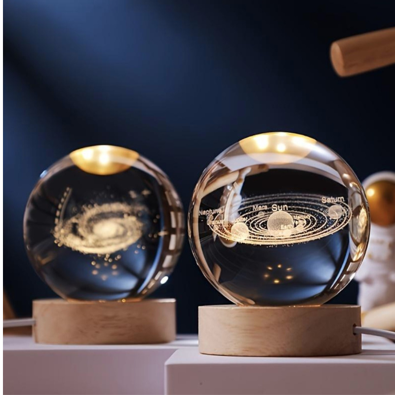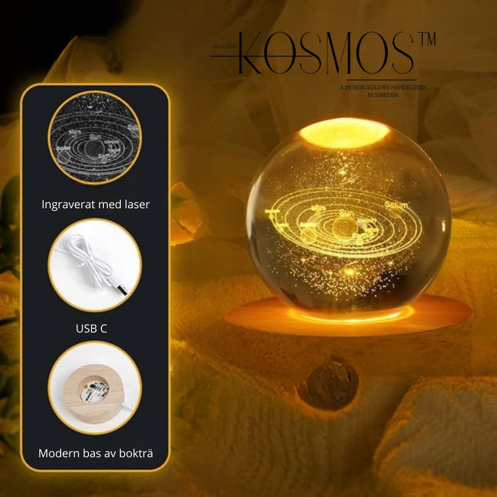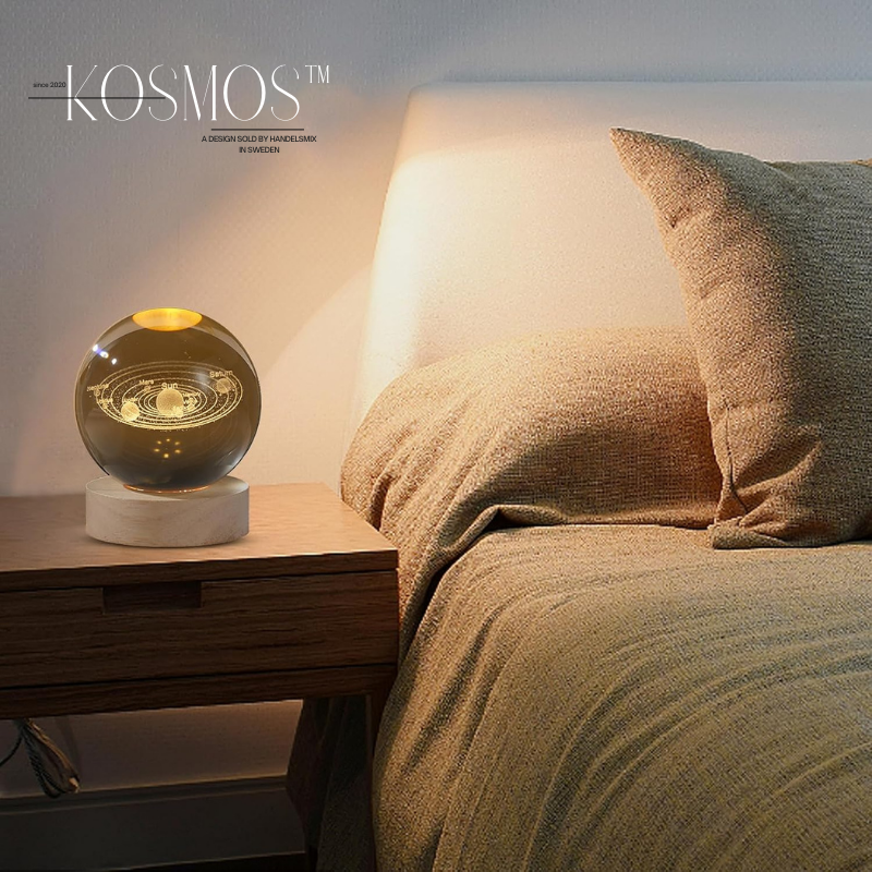 Att ha Kosmos på nattduksbordet förvandlar hela rummet på ett ögonblick. Det varma ljuset sprider sig mjukt genom kristallkulan och ger en trygg, harmonisk känsla — perfekt när du vill varva ner innan läggdags. Motivet som glimmar inuti glaset känns nästan levande och skapar en lugnande, drömlik atmosfär.
